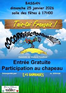 La troupe de théâtre Les Bambades de Servian présente la comédie « Tais-toi François », une pièce pleine de quiproquos, d’imprévus et de rires. Une comédie en trois actes écrite par Viviane Tardivel. L’histoire met en scène Ginette, une retraitée paisible qui loue son gîte à deux couples d’amis : Cosette et Conan d’un côté, Victoire et Vianney de l’autre. Si les deux femmes sont proches depuis toujours, les deux hommes, eux, ne s’apprécient guère. Les vacanciers espèrent que l’air de la campagne dissipera les tensions… mais c’est sans compter sur François, le coq de la propriétaire ! L’animal, dont les cocoricos tonitruants interrompent sans cesse la tranquillité du séjour, ne se calme que lorsqu’on lui lance un énergique « Tais-toi François ! ». Entre imprévus, situations burlesques, maladresses, quiproquos et engueulades, les personnages s’enfoncent dans une série d’événements hilarants qui entraînent le public dans un tourbillon de rires incontrôlables. Entrée au chapeau pas de réservation possible donc venez assez tôt